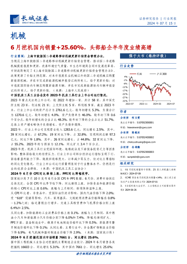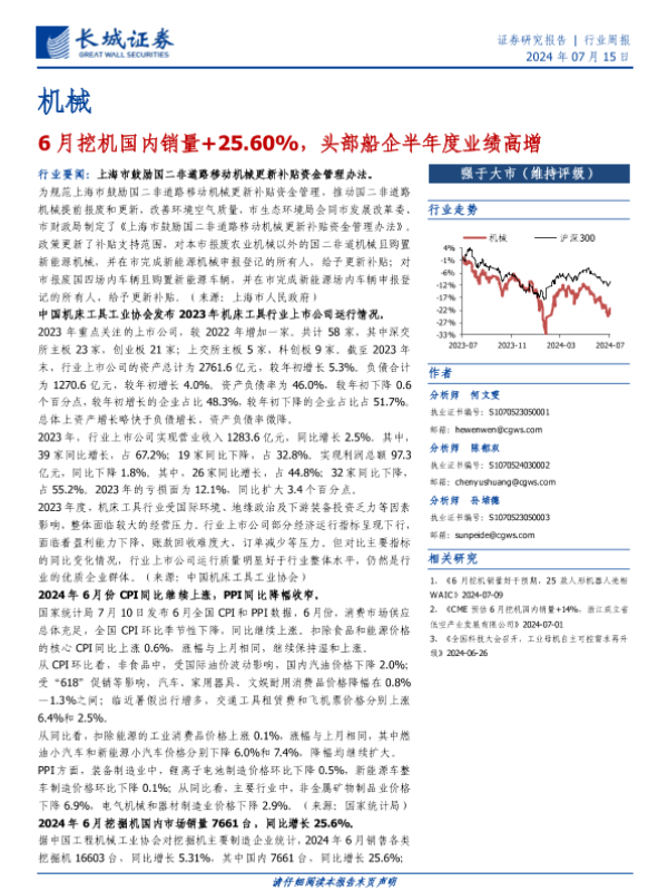 【长城证券】【20240715】20240715-长城证券-机械行业周报:6月挖机国内销量+25.60%,头部船企半年度业绩高增-14页