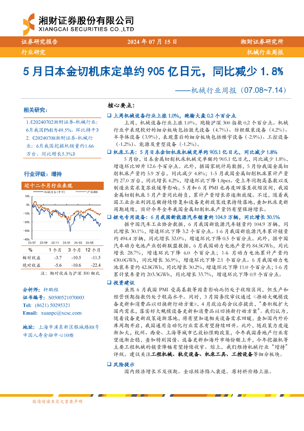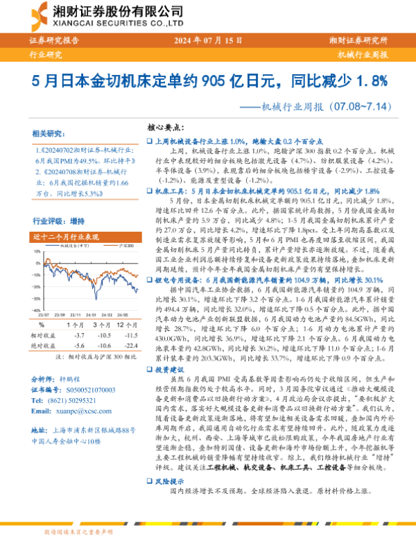 【湘财证券】【20240715】20240715-湘财证券-机械行业周报:5月日本金切机床定单约905亿日元,同比减少1.8%-15页