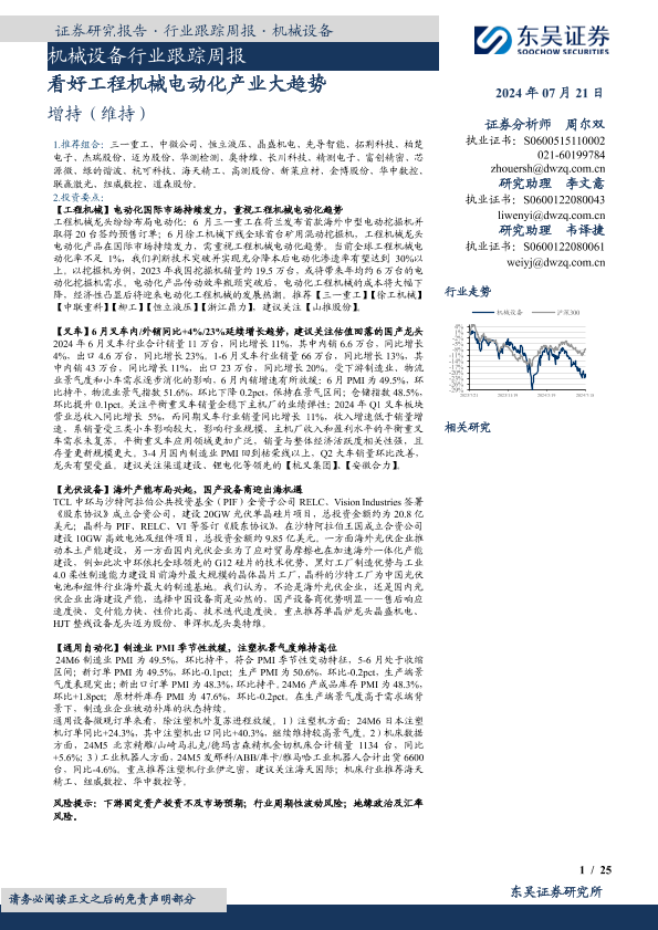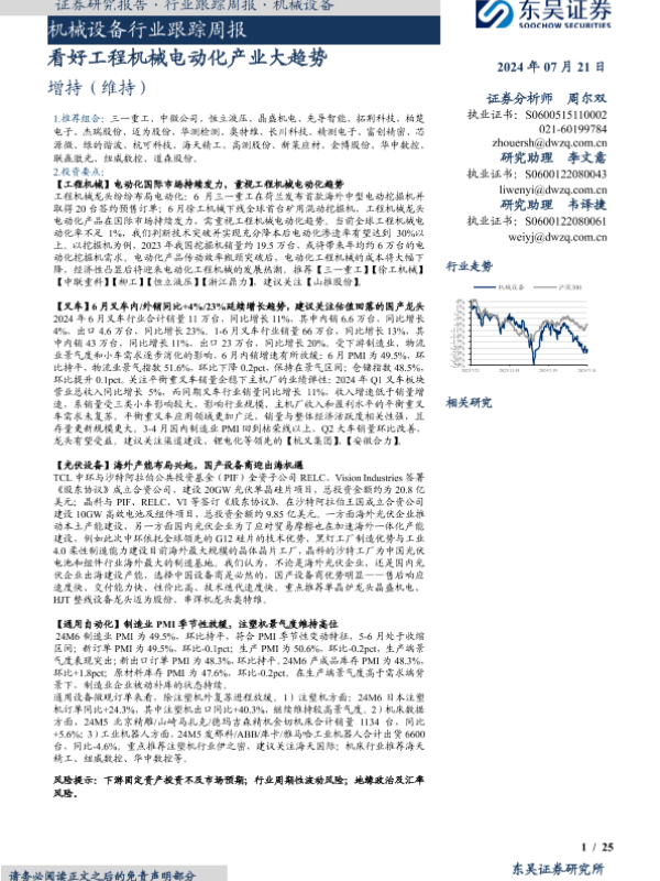 【东吴证券】【20240721】20240721-东吴证券-机械设备行业跟踪周报:看好工程机械电动化产业大趋势-25页