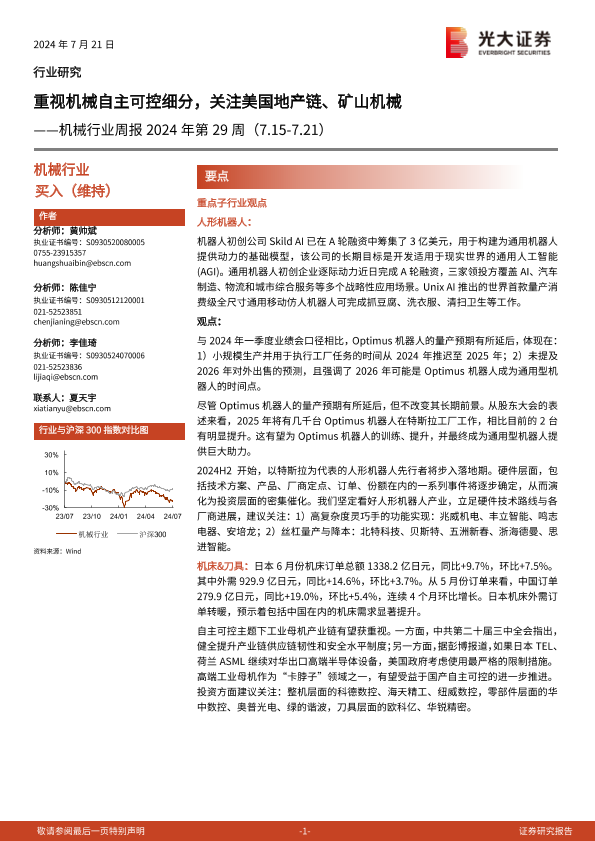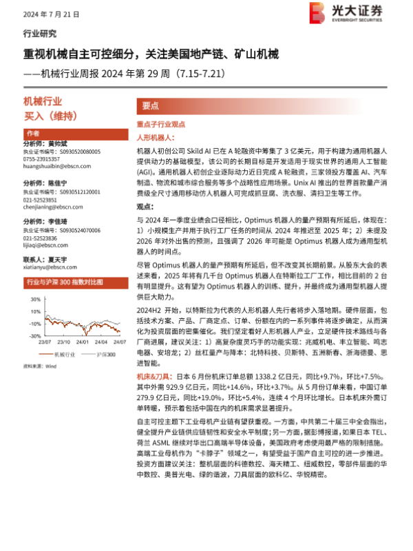 【光大证券】【20240721】机械行业周报2024年第29周:重视机械自主可控细分,关注美国地产链、矿山机械-12页