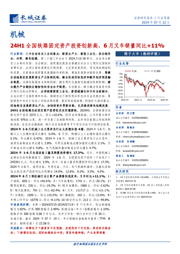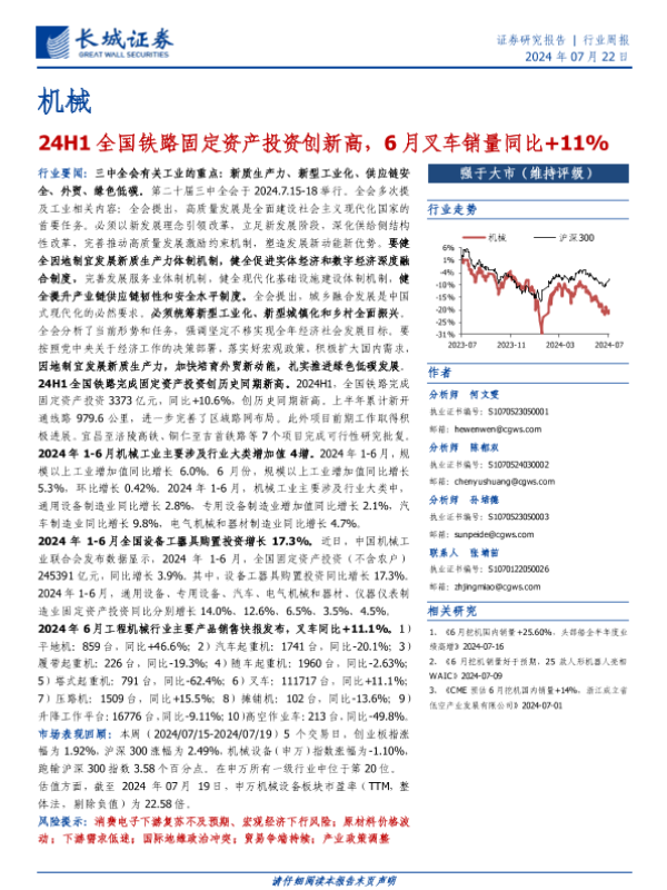 【长城证券】【20240722】24H1全国铁路固定资产投资创新高,6月叉车销量同比+11%-12页
