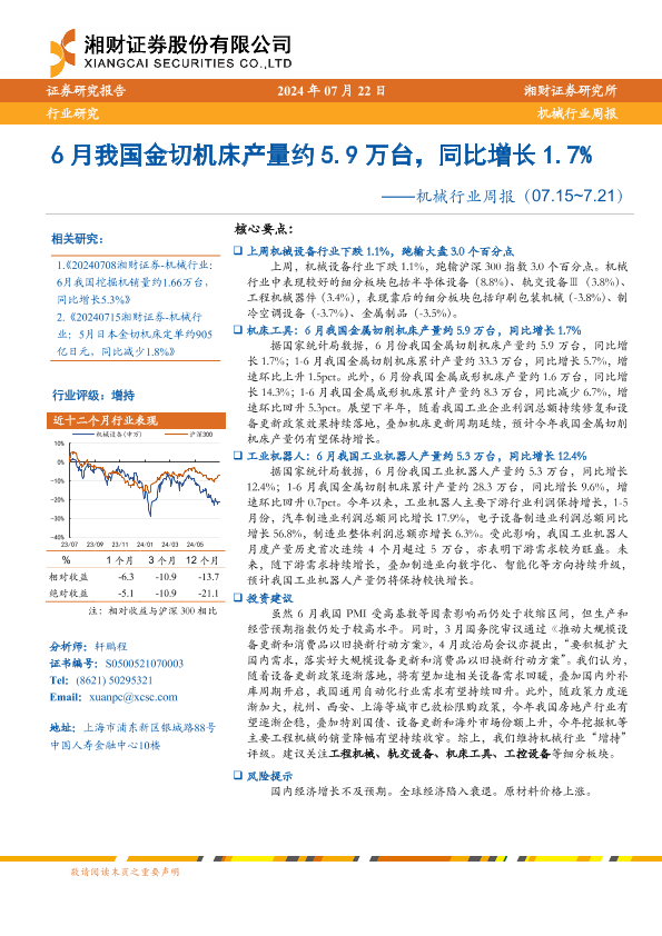 【湘财证券】【20240722】20240722-湘财证券-机械行业周报:6月我国金切机床产量约5.9万台,同比增长1.7%-15页