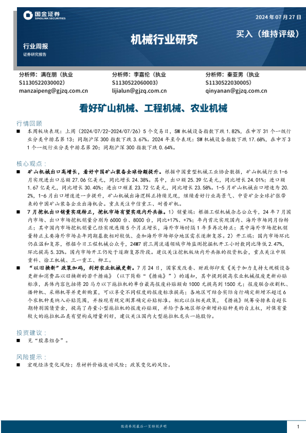 【国金证券】【20240727】20240727-国金证券-机械行业研究周报:看好矿山机械、工程机械、农业机械-16页