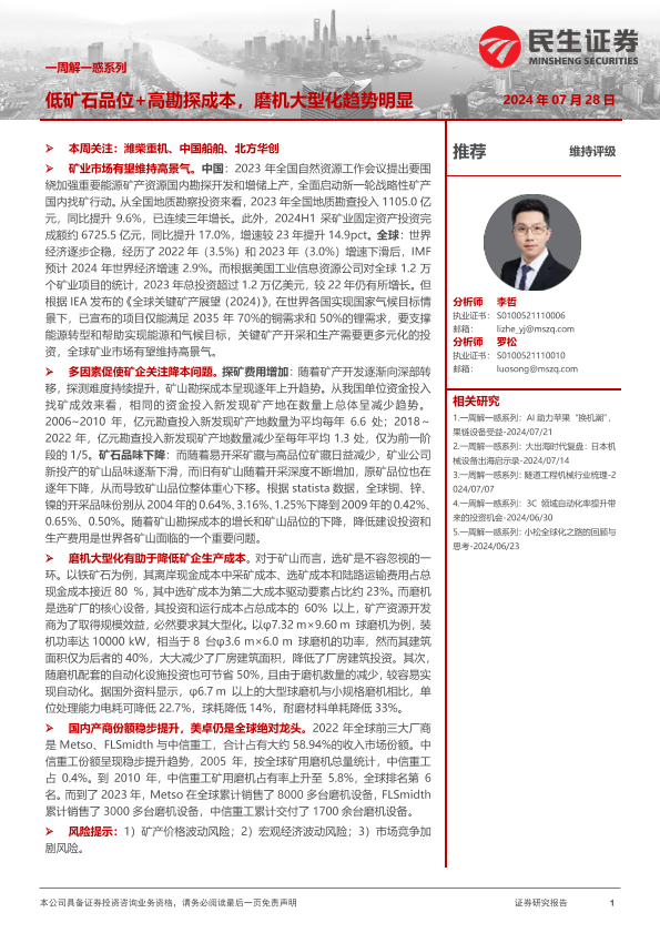 【民生证券】【20240728】20240728-民生证券-机械一周解一惑系列:低矿石品位+高勘探成本,磨机大型化趋势明显-17页