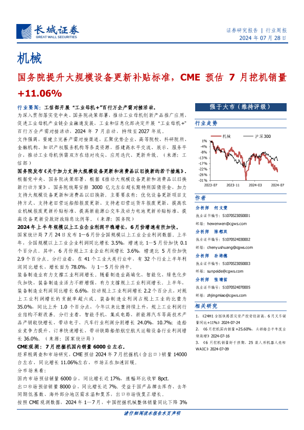 【长城证券】【20240728】20240728-长城证券-机械行业周报:国务院提升大规模设备更新补贴标准,CME预估7月挖机销量+11.06%-14页