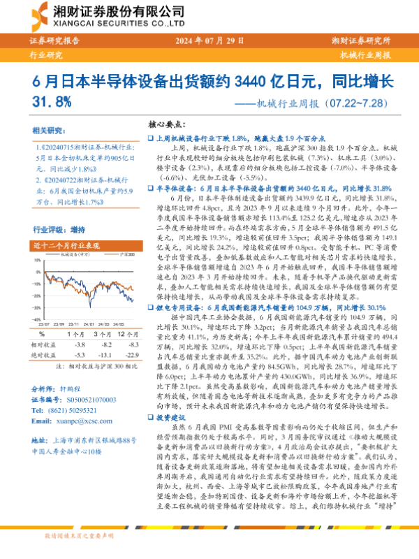 【湘财证券】【20240729】20240729-湘财证券-机械行业周报:6月日本半导体设备出货额约3440亿日元,同比增长31.8%-16页