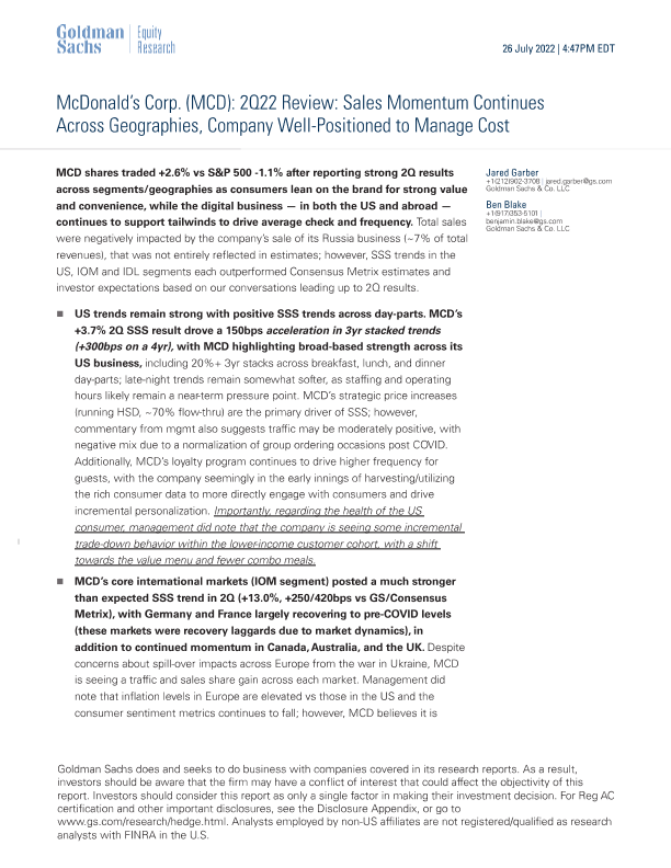 【Goldman Sachs】【20220726】McDonald’s Corp.(MCD) 2Q22 Review Sales Momentum Continues Across Geographies, Company Well-Positioned to Manage Cost-9页
