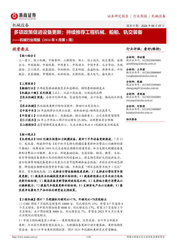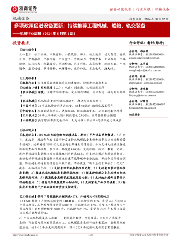 【浙商证券】【20240807】机械行业周报(2024年8月第1周):多项政策促进设备更新;持续推荐工程机械、船舶、轨交装备-28页