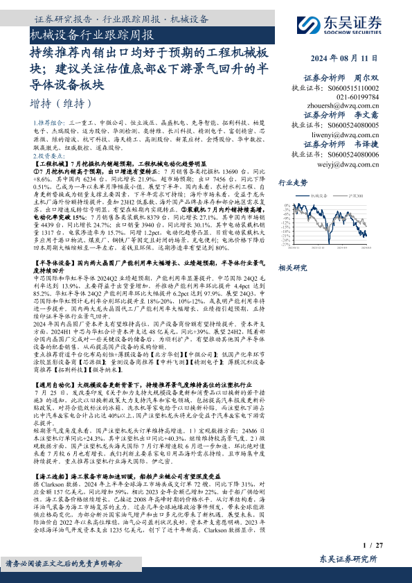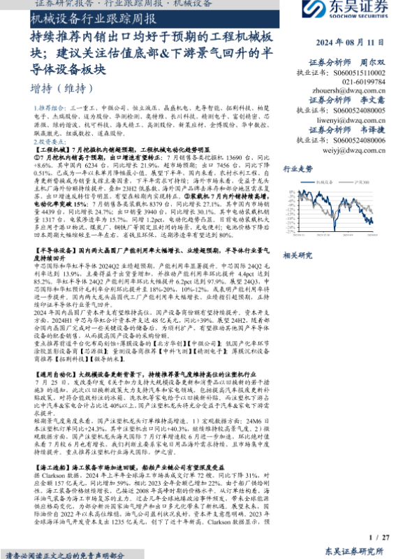 【东吴证券】【20240811】20240811-东吴证券-机械设备行业跟踪周报:持续推荐内销出口均好于预期的工程机械板块;建议关注估值底部&下游景气回升的半导体设备板块-27页