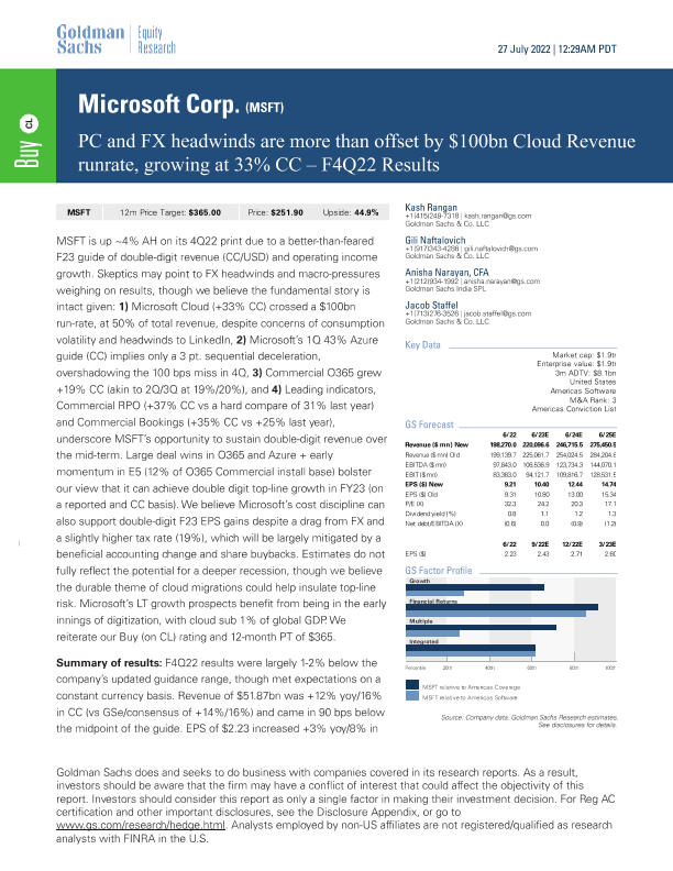 【Goldman Sachs】【20220727】PC和FX逆风被1000亿美元云收入增长率33%所抵消 - 2022财年第四季度业绩-11页