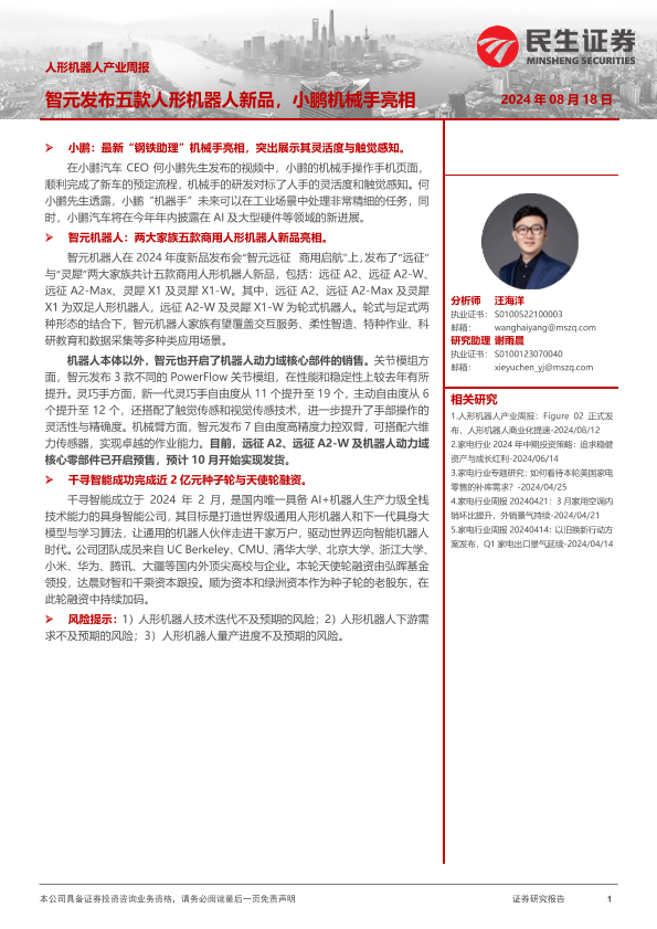 【民生证券】【20240818】人形机器人产业周报:智元发布五款人形机器人新品,小鹏机械手亮相-10页