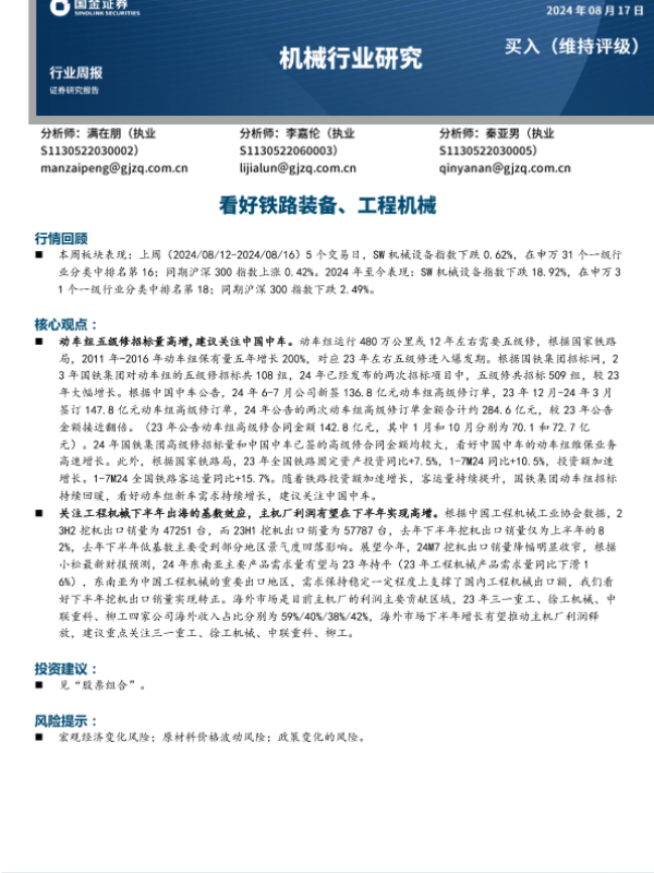 【国金证券】【20240817】20240817-国金证券-机械行业周报:看好铁路装备、工程机械-17页