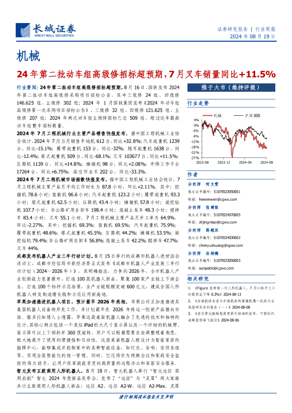 【长城证券】【20240819】20240819-长城证券-机械行业周报:24年第二批动车组高级修招标超预期,7月叉车销量同比+11.5%-15页