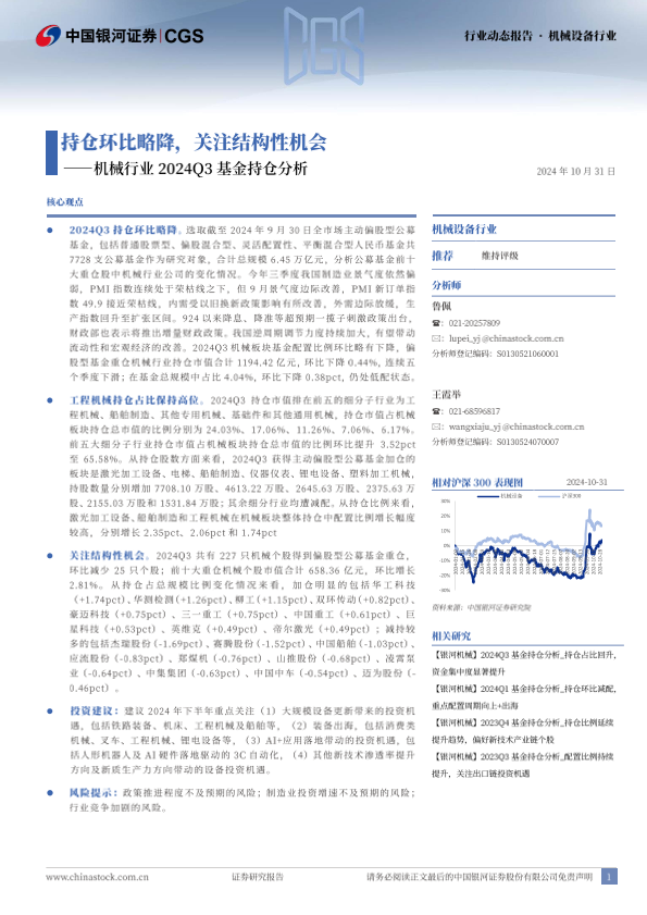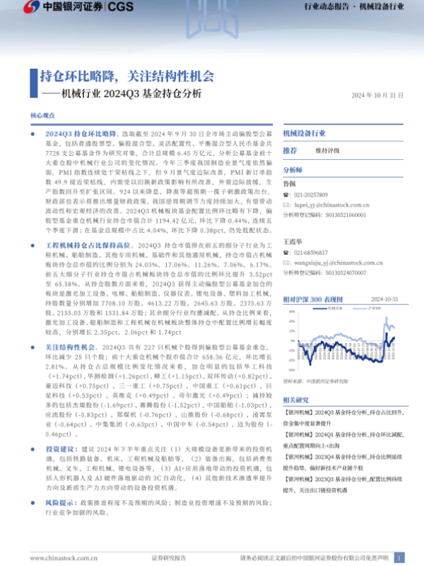 【银河证券】【20241101】机械行业2024Q3基金持仓分析:持仓环比略降,关注结构性机会-11页