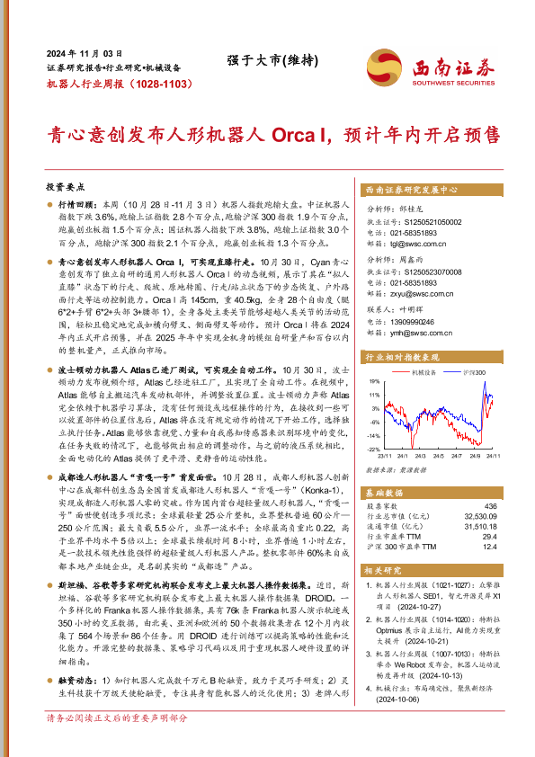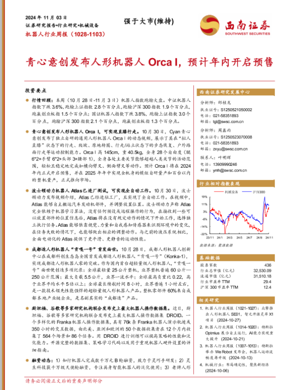 【西南证券】【20241103】机器人行业周报:青心意创发布人形机器人Orca I,预计年内开启预售-13页