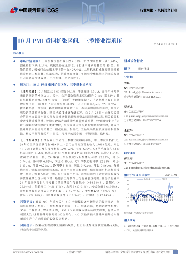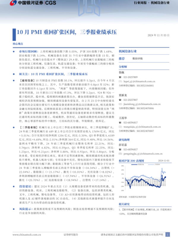 【银河证券】【20241103】20241103-中国银河-机械设备行业行业周报:10月PMI重回扩张区间,三季报业绩承压-10页