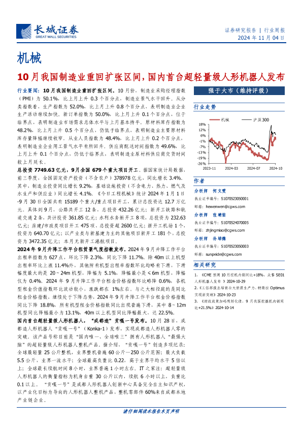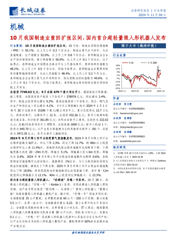 【长城证券】【20241104】20241104-长城证券-机械行业周报:10月我国制造业重回扩张区间,国内首台超轻量级人形机器人发布-14页