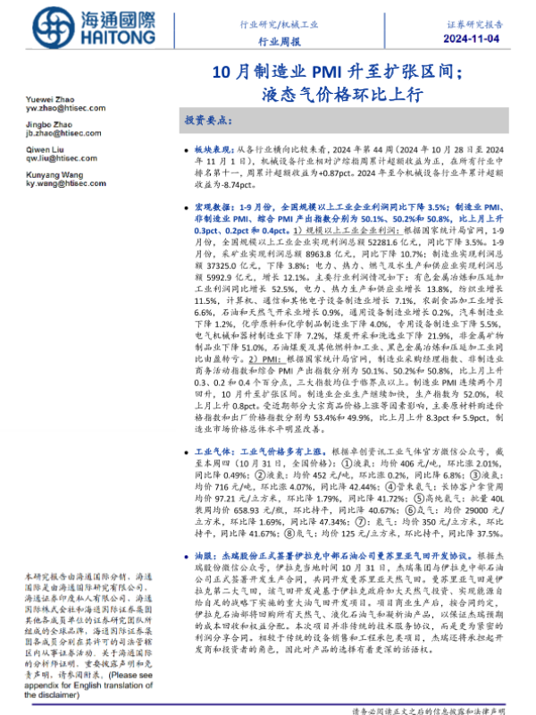 【海通国际】【20241104】20241104-海通国际-机械工业行业周报:10月制造业PMI升至扩张区间;液态气价格环比上行-17页