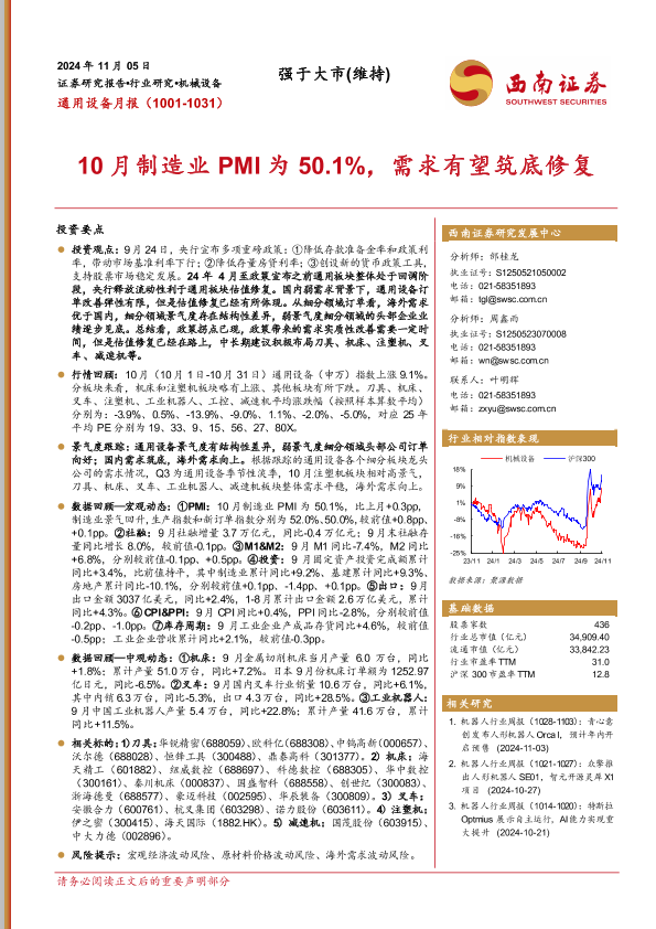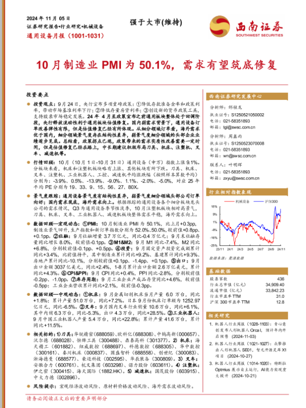 【西南证券】【20241105】20241105-西南证券-通用设备月报:10月制造业PMI为50.1%,需求有望筑底修复-13页