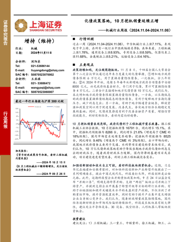 【上海证券】【20241111】20241111-上海证券-机械设备行业周报:化债政策落地,10月挖机销量延续正增-15页
