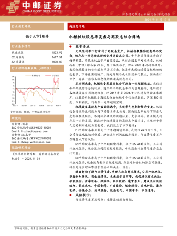【中邮证券】【20241117】20241117-中邮证券-高股息专题:机械板块股息率复盘与高股息组合筛选-15页