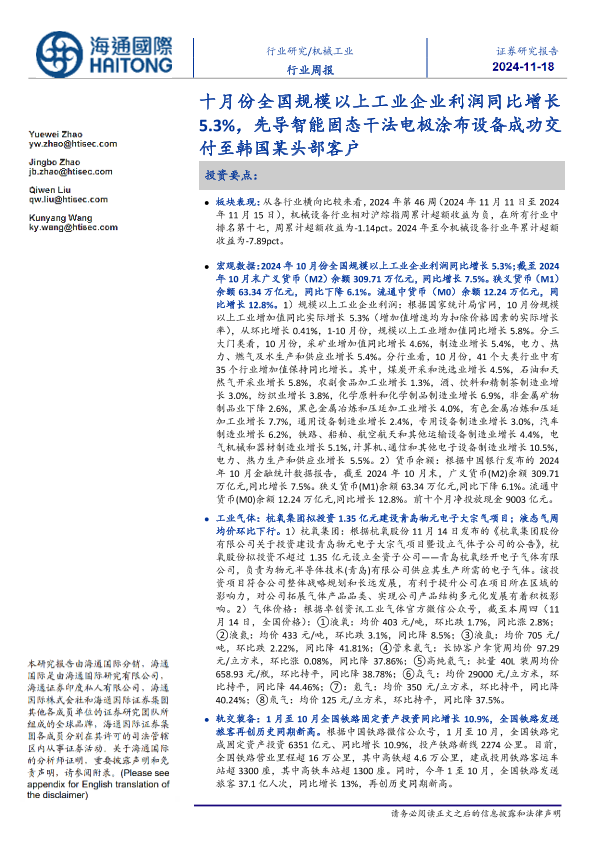 【海通国际】【20241118】20241118-海通国际-机械工业行业周报:十月份全国规模以上工业企业利润同比增长5.3%,先导智能固态干法电极涂布设备成功交付至韩国某头部客户-17页