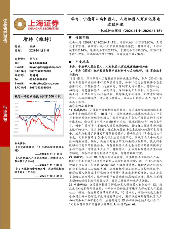 【上海证券】【20241121】20241121-上海证券-机械行业周报:华为、宁德等入局机器人,人形机器人商业化落地进程加速-17页