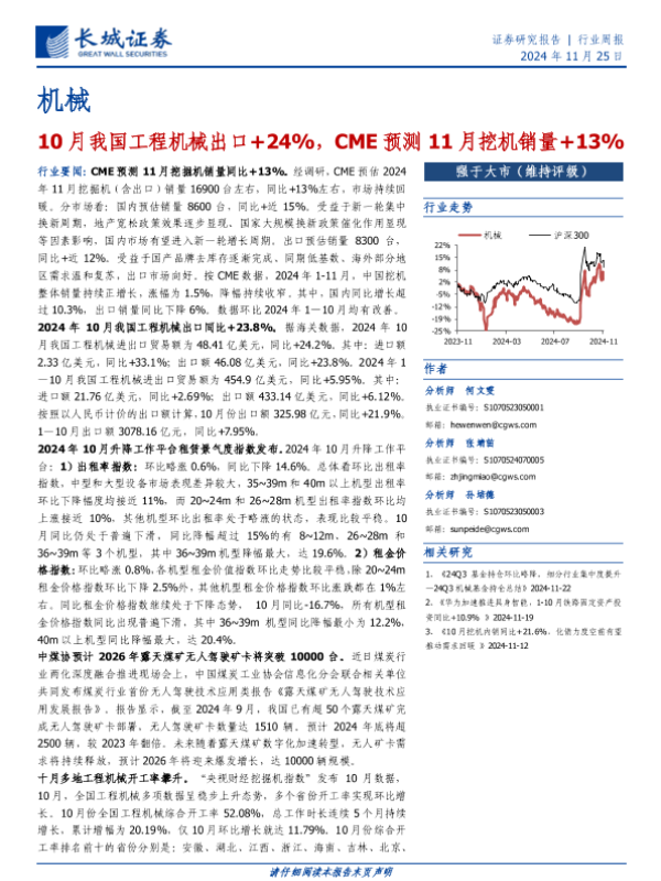 【长城证券】【20241125】20241125-长城证券-机械行业周报:10月我国工程机械出口+24%,CME预测11月挖机销量+13%-14页