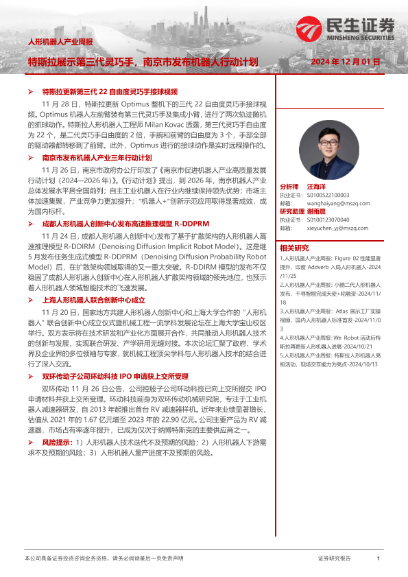 【民生证券】【20241201】人形机器人产业周报:特斯拉展示第三代灵巧手,南京市发布机器人行动计划-10页