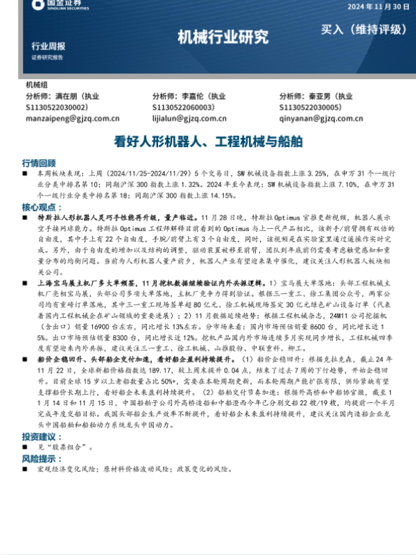 【国金证券】【20241130】20241130-国金证券-机械行业周报:看好人形机器人、工程机械与船舶-19页