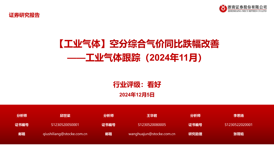 【浙商证券】【20241205】20241205-浙商证券-工业气体跟踪(2024年11月):【工业气体】空分综合气价同比跌幅改善-23页