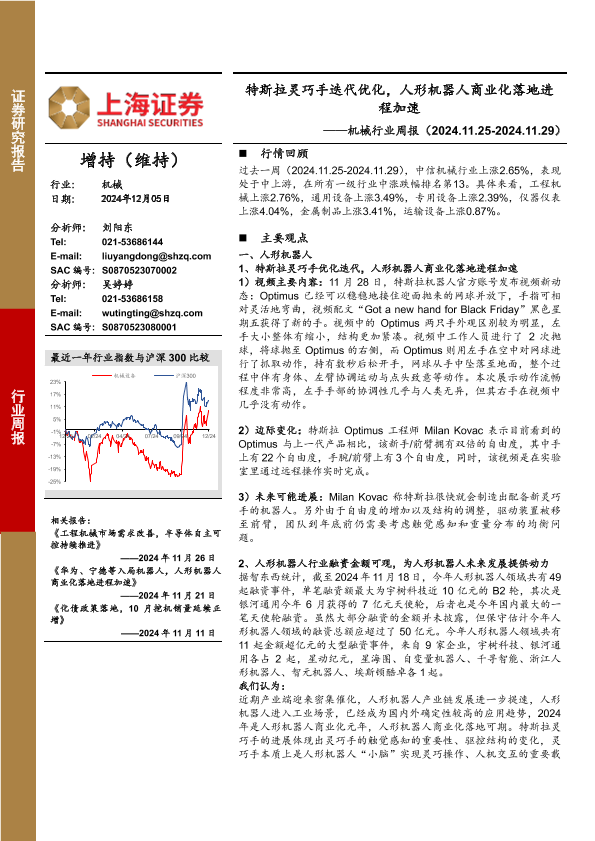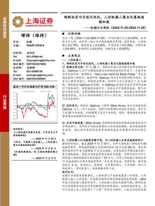 【上海证券】【20241205】20241205-上海证券-机械行业周报:特斯拉灵巧手迭代优化,人形机器人商业化落地进程加速-16页