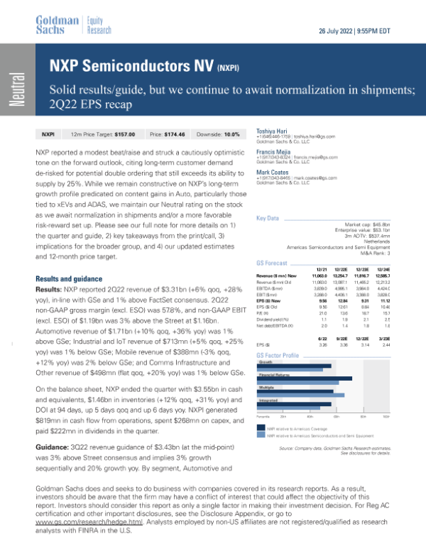 【Goldman Sachs】【20220726】NXP Semiconductors NV(NXPI) Solid results/guide, but we continue to await normalization in shipments; 2Q22 EPS recap-10页