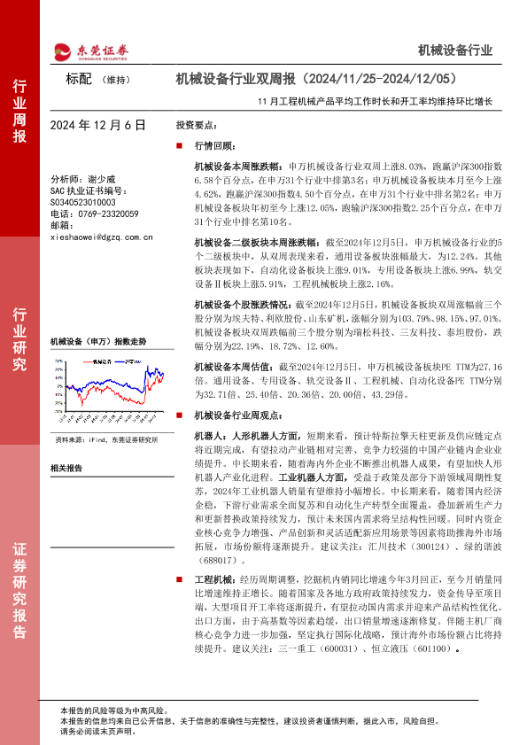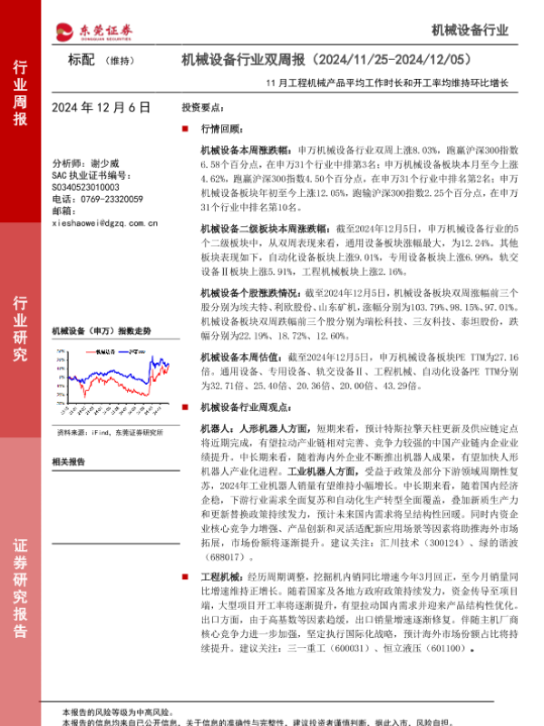 【东莞证券】【20241206】机械设备行业双周报:11月工程机械产品平均工作时长和开工率均维持环比增长-13页