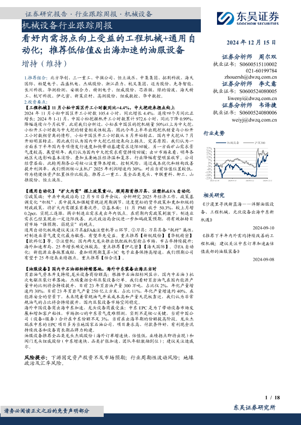 【东吴证券】【20241215】20241215-东吴证券-机械设备行业跟踪周报:看好内需拐点向上受益的工程机械+通用自动化;推荐低估值&出海加速的油服设备-18页