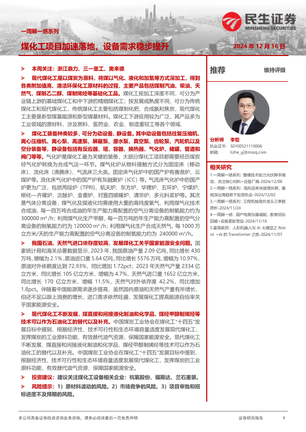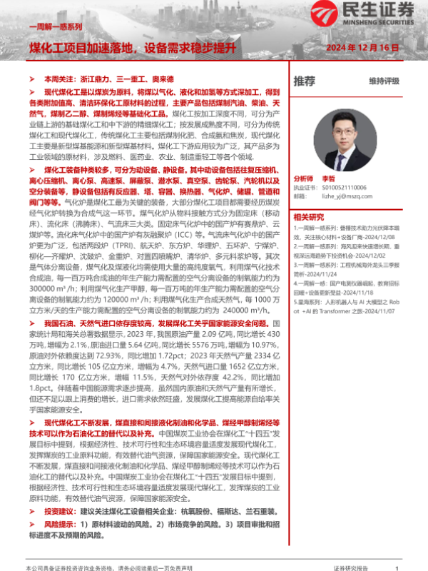 【民生证券】【20241216】机械一周解一惑系列:煤化工项目加速落地,设备需求稳步提升-17页