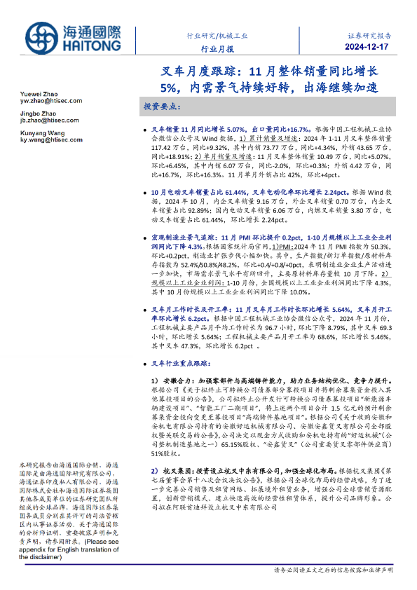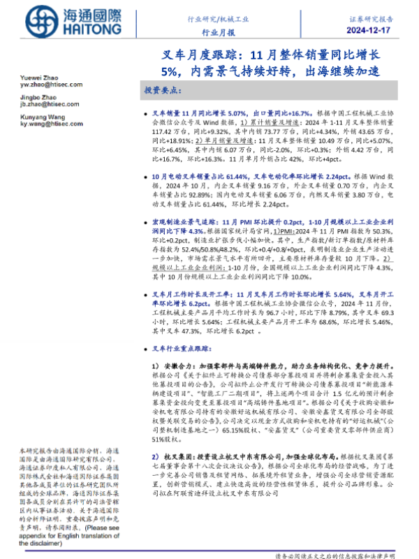 【海通国际】【20241217】20241217-海通国际-叉车月度跟踪:11月整体销量同比增长5%,内需景气持续好转,出海继续加速-12页