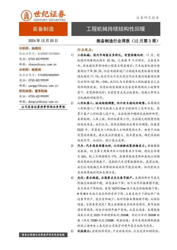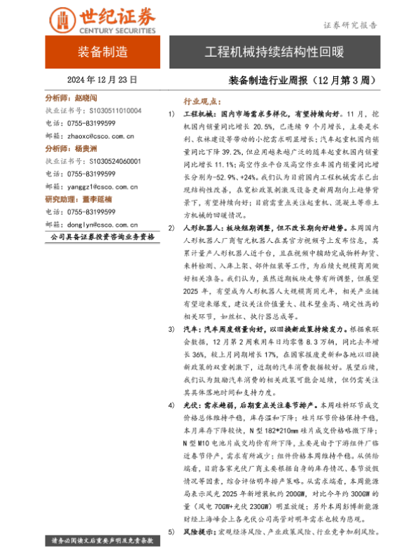 【世纪证券】【20241223】20241223-世纪证券-装备制造行业周报(12月第3周):工程机械持续结构性回暖-10页