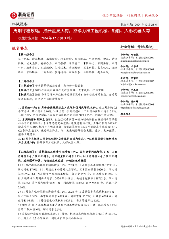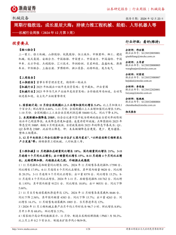 【浙商证券】【20241223】机械行业周报(2024年12月第3周):周期行稳致远,成长星辰大海;持续力推工程机械、船舶、人形机器人等-28页