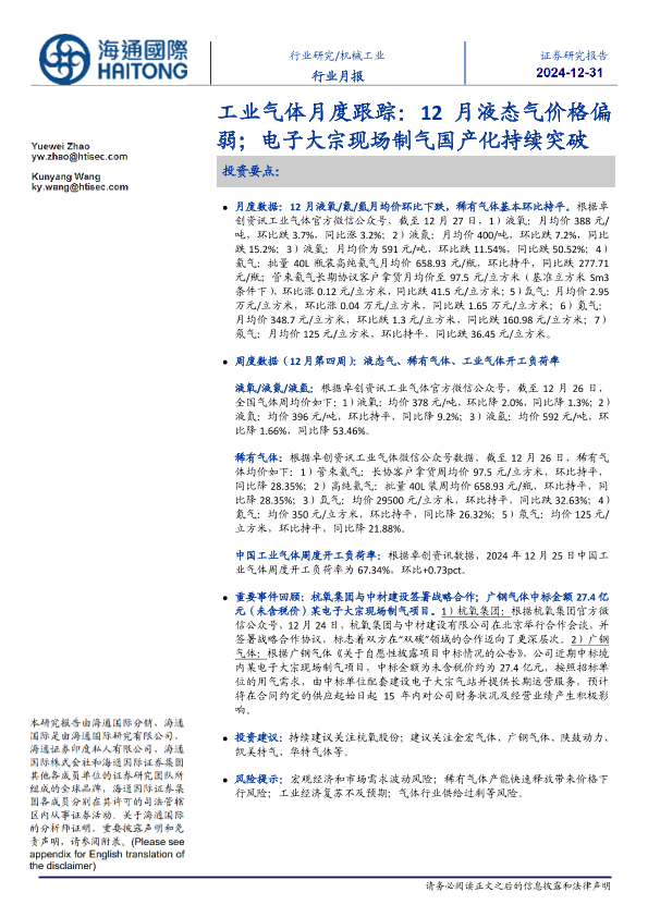 【海通国际】【20241231】工业气体月度跟踪:12月液态气价格偏弱;电子大宗现场制气国产化持续突破-11页