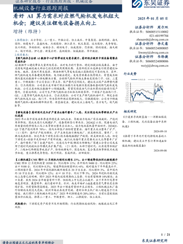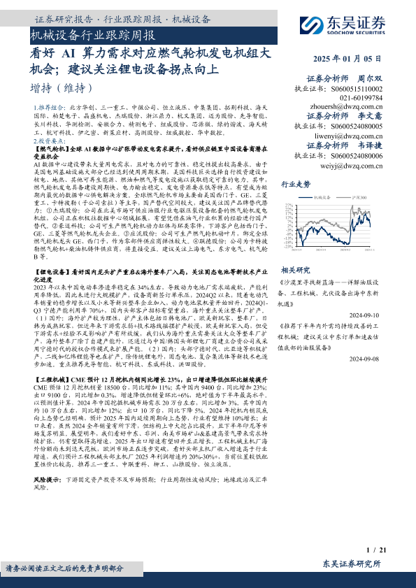 【东吴证券】【20250105】20250105-东吴证券-机械设备行业跟踪周报:看好AI算力需求对应燃气轮机发电机组大机会;建议关注锂电设备拐点向上-21页