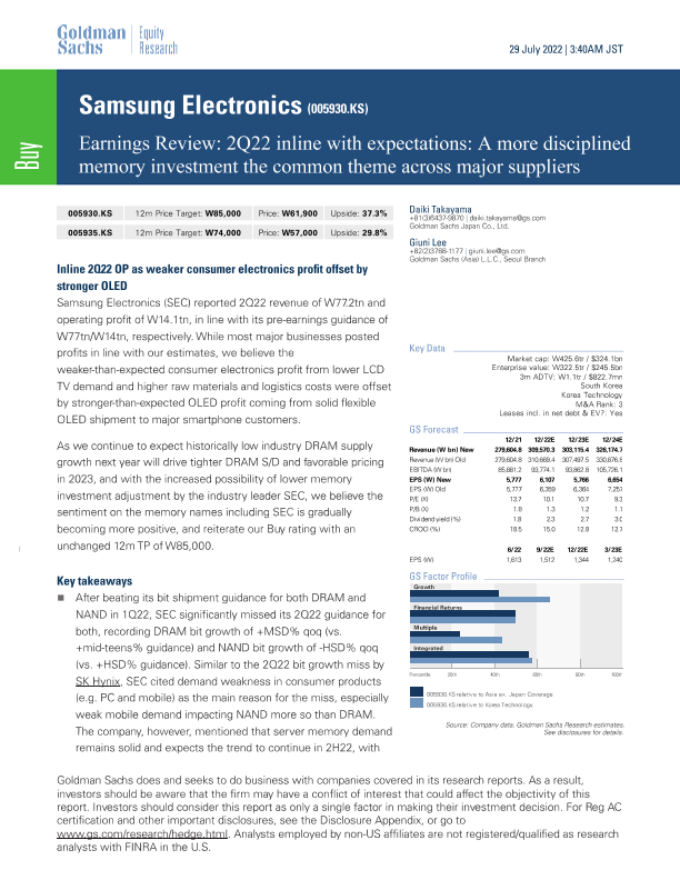 【Goldman Sachs】【20220729】Samsung Electronics Earnings Review 2Q22 inline with expectations A more disciplined memory investment the common theme across major suppliers-12页