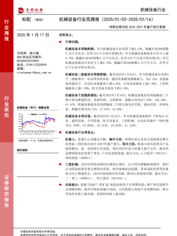 【东莞证券】【20250117】20250117-东莞证券-机械设备行业双周报:特斯拉擎天柱2025-2027年量产指引更新-13页