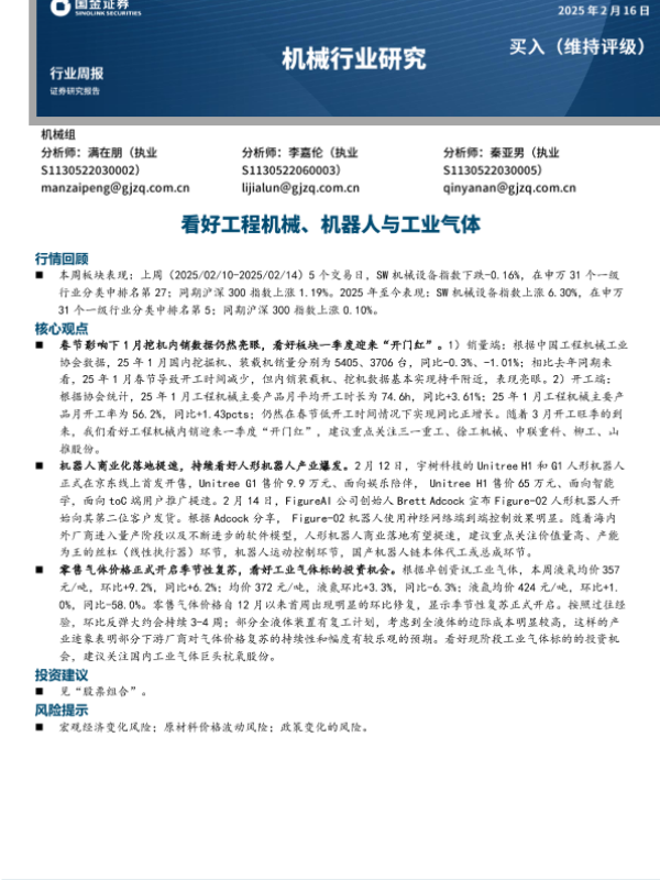 【国金证券】【20250216】20250216-国金证券-机械行业周报:看好工程机械、机器人与工业气体-17页