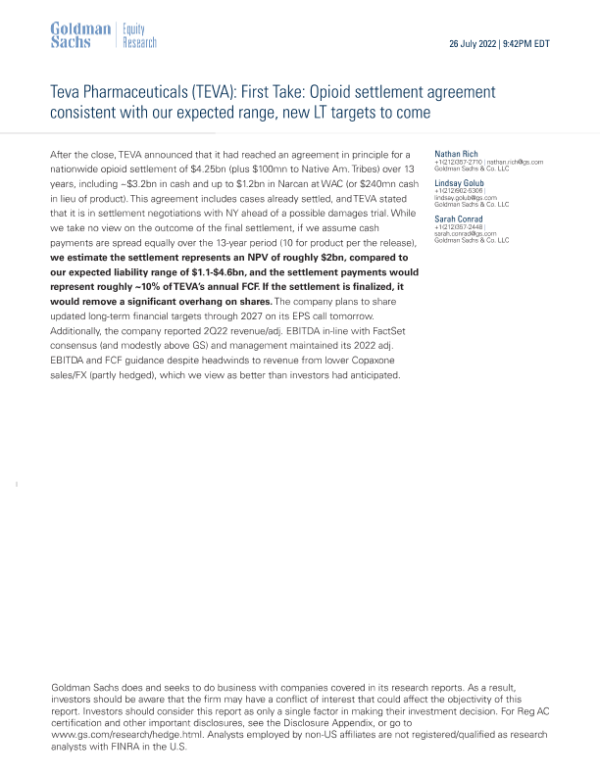【Goldman Sachs】【20220726】Teva Pharmaceuticals First Take Opioid settlement agreement consistent with our expected range, new LT targets to come-7页