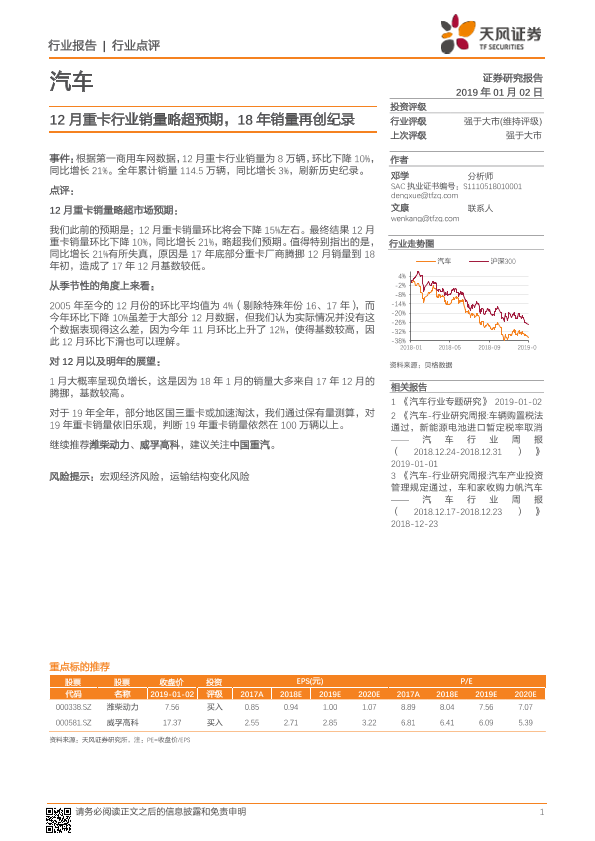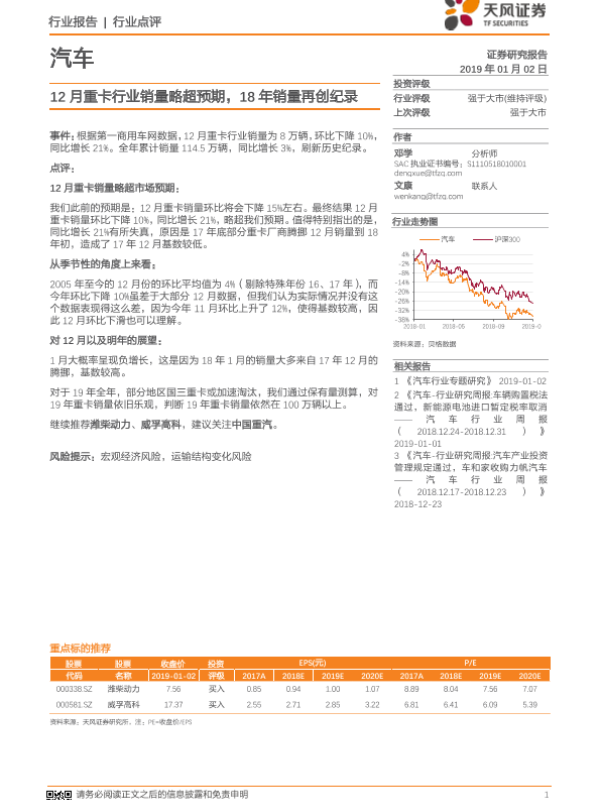 【天风证券】【20190102】12月重卡行业销量略超预期,18年销量再创纪录-8页
