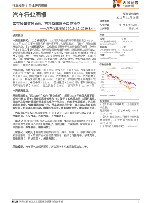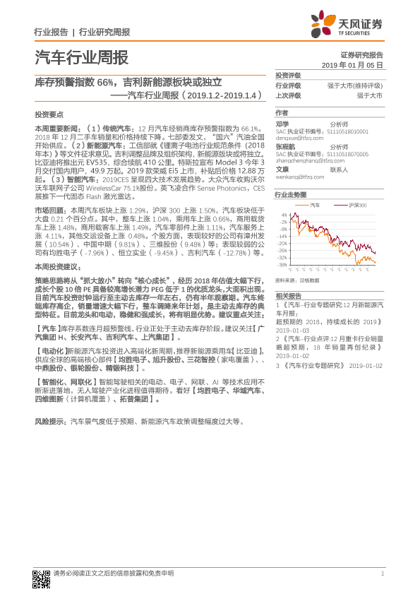 【天风证券】【20190105】汽车行业周报:库存预警指数66%,吉利新能源板块或独立-25页