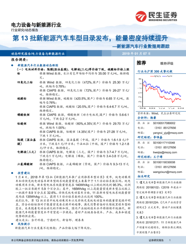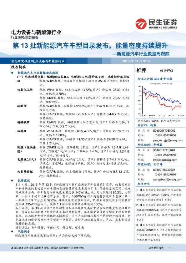 【民生证券】【20190107】20190107-民生证券-新能源汽车行业数据周跟踪:第13批新能源汽车车型目录发布,能量密度持续提升-12页