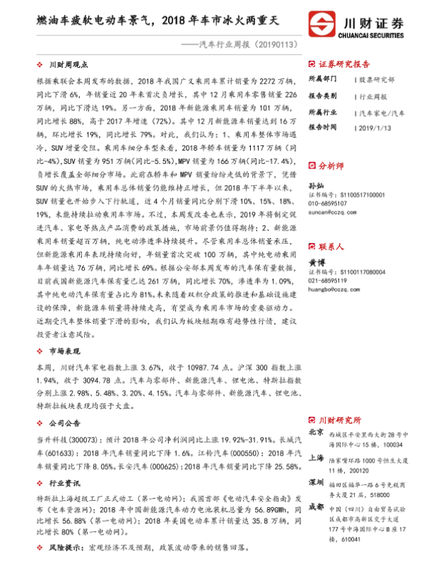 【川财证券】【20190113】20190113-川财证券-汽车行业周报:燃油车疲软电动车景气,2018年车市冰火两重天-12页