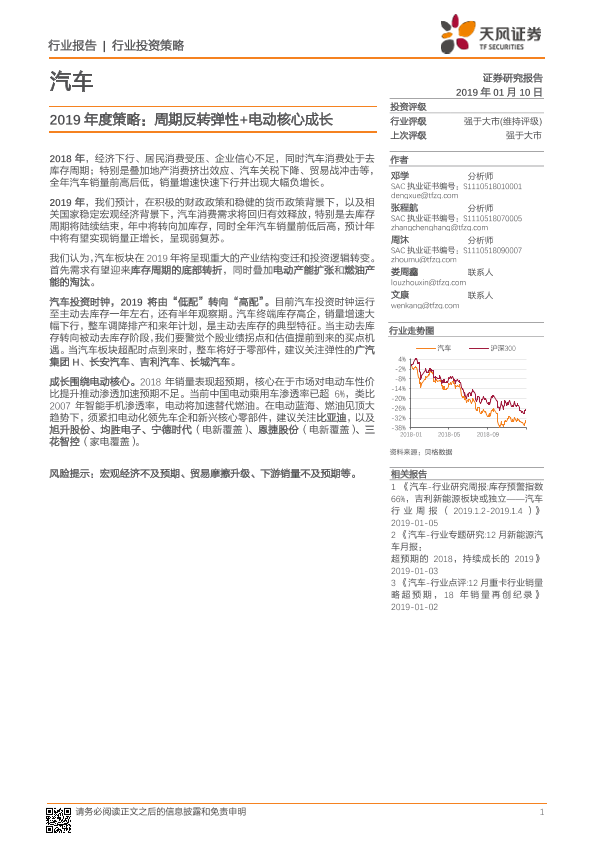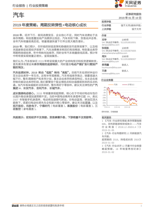 【天风证券】【20190110】汽车行业2019年度策略:周期反转弹性+电动核心成长-45页